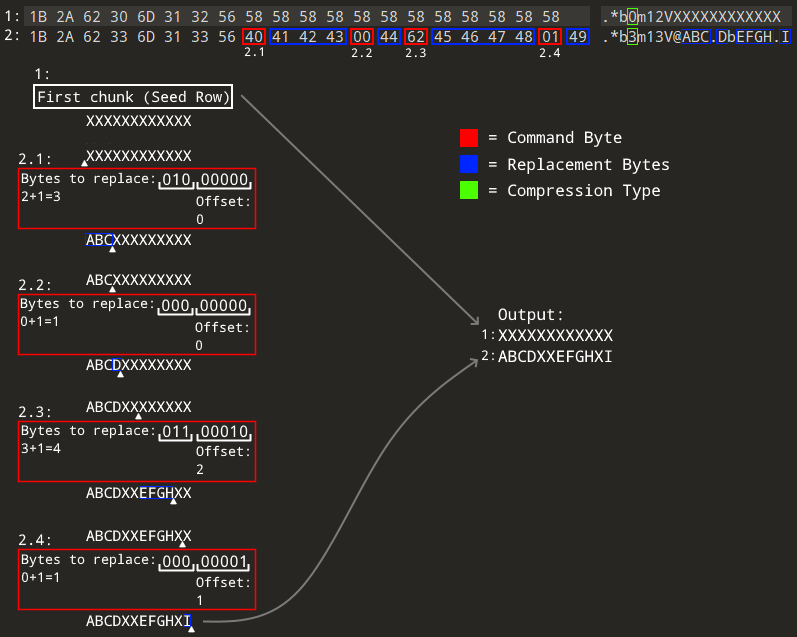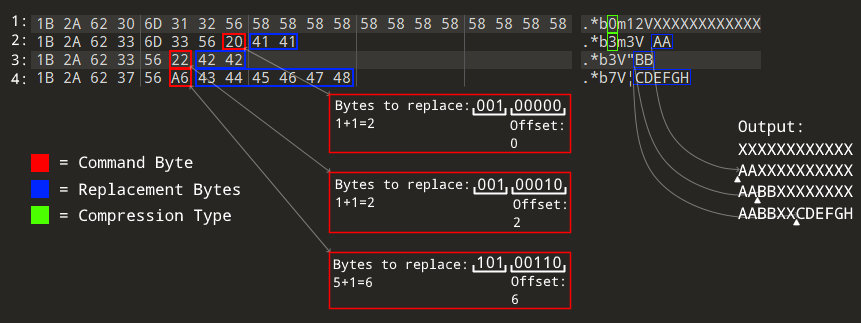 This (CommandByte)(ReplacementBytes) structure is repeated multiple times if the Chunk requires more than eight replacement bytes, the offset then specifies the offset from the last replaced byte.